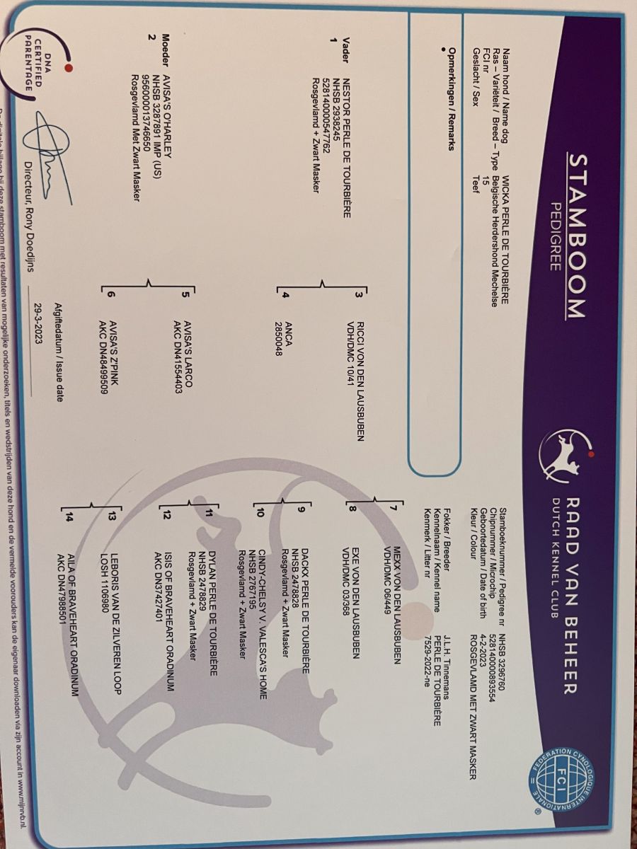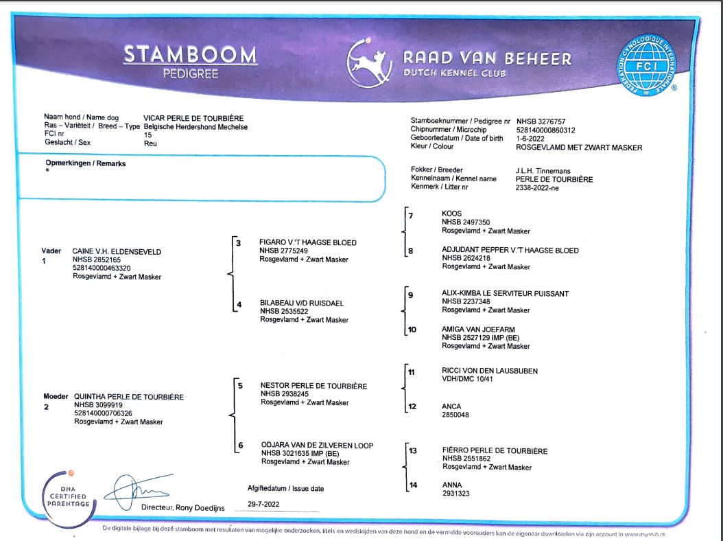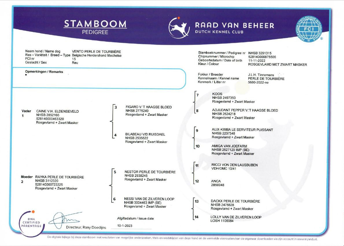 Klik op de naam van de hond om de stamboom te zien.